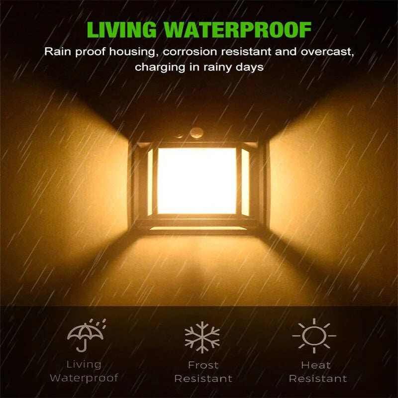 Smart Motion Sensor: The solar wall light has a built-in intelligent motion sensor that sensitively detects motion within a 120° angle within 4 meters. Press the on/off to switch 3 different modes: [1]When motion is detected, the wall light will turn on to 100%, and will be off after the movement leavs for 15s. [2] When motion is detected, it will turn on to 100%, the solar wall light will change to 50% brightness after the movement leaves for 15s. [3] Always keep 50% low brightness mode all night.