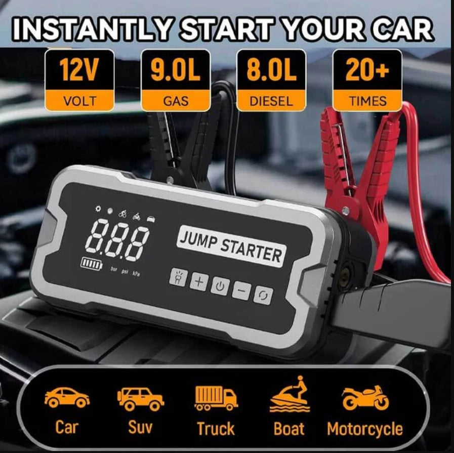 Don't hesitate any longer for you and your family safety! We introduced this 4 in 1 portable jump starter, a versatile 8000A jump starter that brings safety preparation and convenience on your road, drive safer peace of mind.