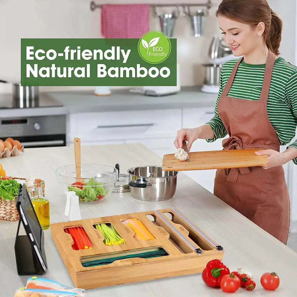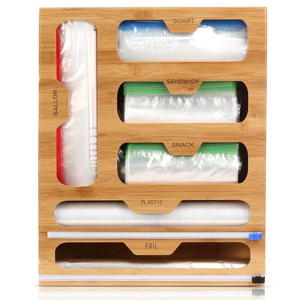 Bamboo Ziplock Bag Organizer And Foil And Plastic Wrap Organizer, Aluminum Foil Organization And Storage, Plastic Wrap Dispenser With Cutter For Kitchen Drawer For Gallon, Quart, Sandwich, Snack, Kitchen Supplies