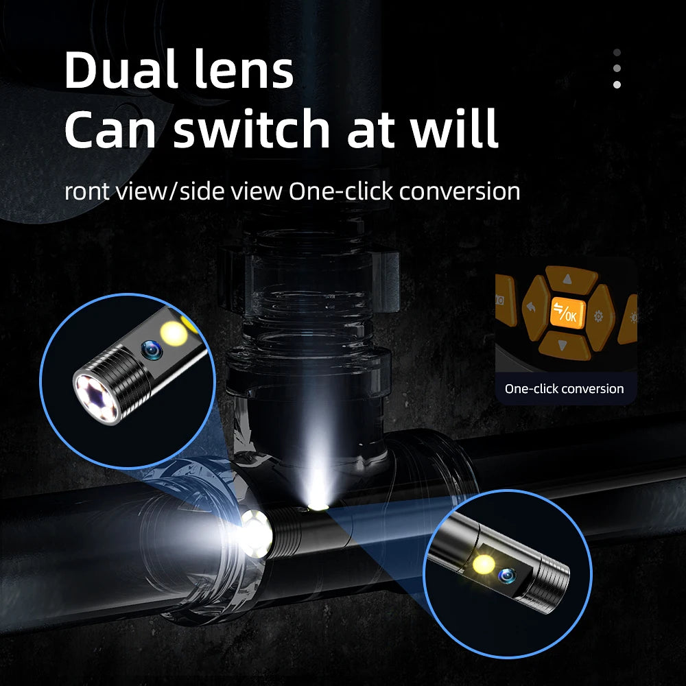 Our endoscope with dual lenses on the front and side, easy to shift the viewing angle you want with just once press one key switch. The equipped 8 LED beads, can adjust the brightness.