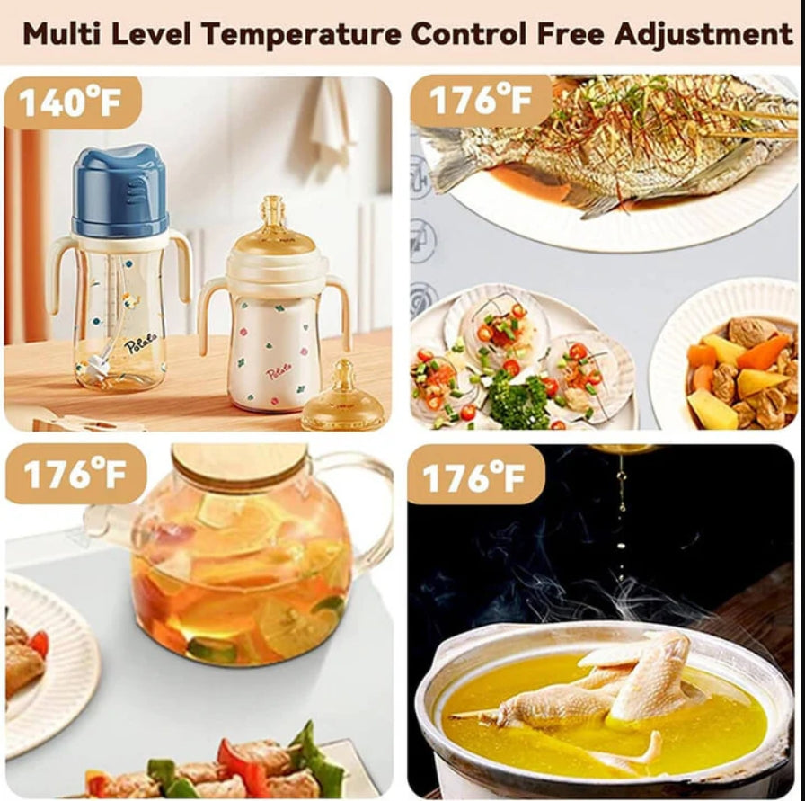 Say goodbye to disappointingly cool meals with our innovative Food Warming Mat! It can rapidly heat up food with 250W in 10s, heats evenly to 100℃/212°F in 10 Mins, and it can adjust the temperature and timing. To keep your food hot and flavorsome, this mat is a game-changer for busy households and gatherings!