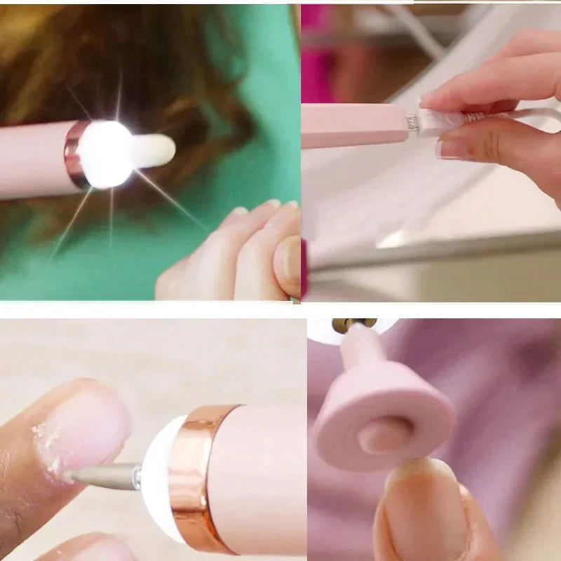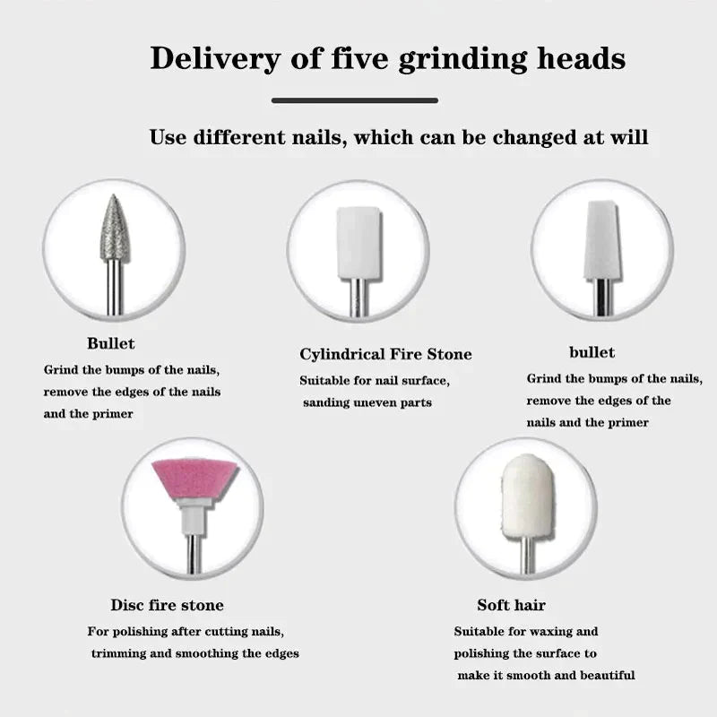 It includes 5 different heads to shape your nails, remove cuticles, trim your cuticles and polish your nails.