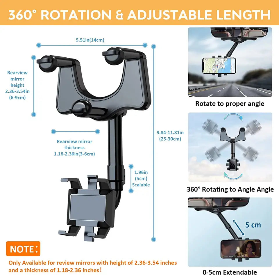 Rotatable and Retractable Car Phone Holder - The multifunctional car rearview mirror phone holder with 360° rotation design, you can put your cell phone in any direction (horizontal, vertical and more) as you like to enjoy the best driving experience. The arm length can be telescoped 0-5cm without obstructing your vision and ensure a safer travel for you and your family.