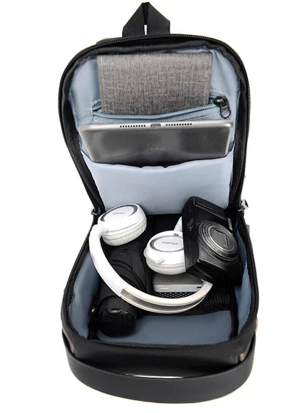 Reinforced cut-proof material, hidden zippers, and a secure locking mechanism